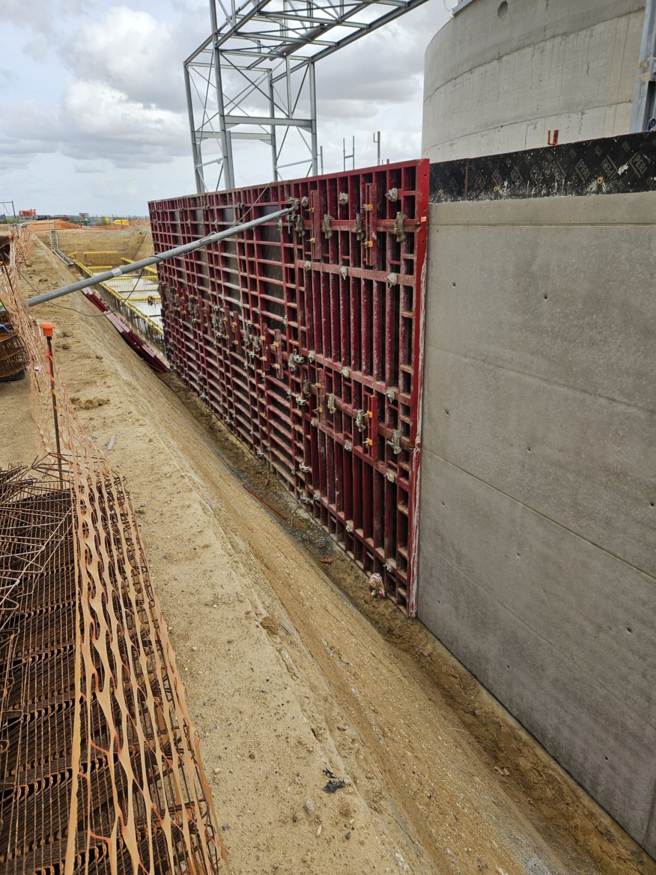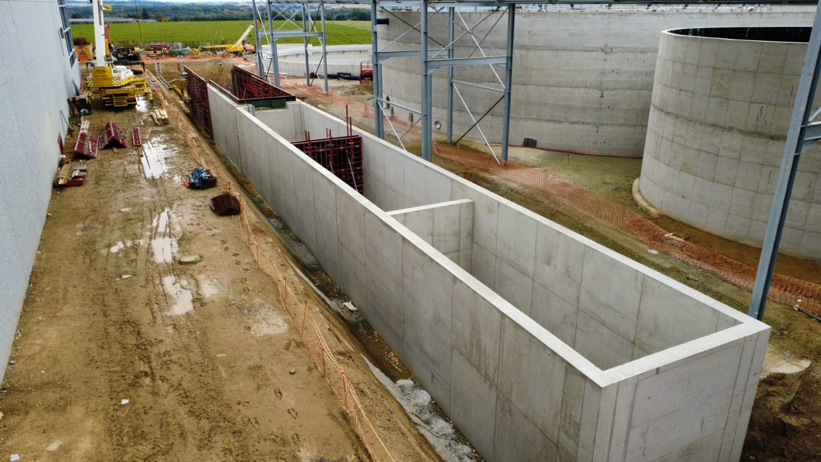 👉 Réalisation d’un bassin de décantation de 90 mètres de long, constitué de voiles en béton de 5 m de hauteur et 40 cm d’épaisseur.
